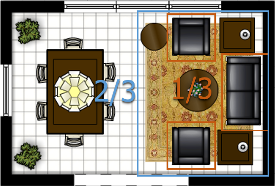 If we think of this in terms of the golden ratio, we have a proportionate room, but it’s a little too equal. Remember the line analogy from before: the whole length of the line divided by the longer part is also equal to the long part divided by the short part. If we apply that thinking to this space we know that as long as we stay within the rule of thirds, we will have a golden ratio. So, let’s divide the room once more. We’ll leave 1/3 of the space alone and we’ll combine 2/3 together. Now we have a “short part” and a “long part”. We haven’t messed with the equanimity of the space, so we’re good.