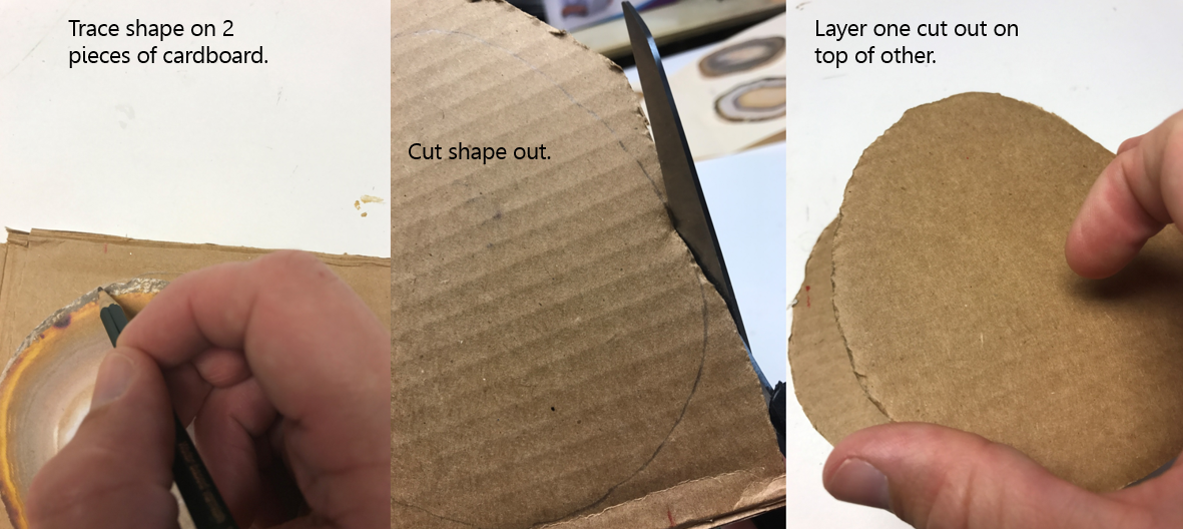 Now trace your cut out agate pictures on a piece of cardboard twice and then cut out the two pieces. Layer one piece of cut out cardboard on top of the other, lining up the shapes so they match exactly.