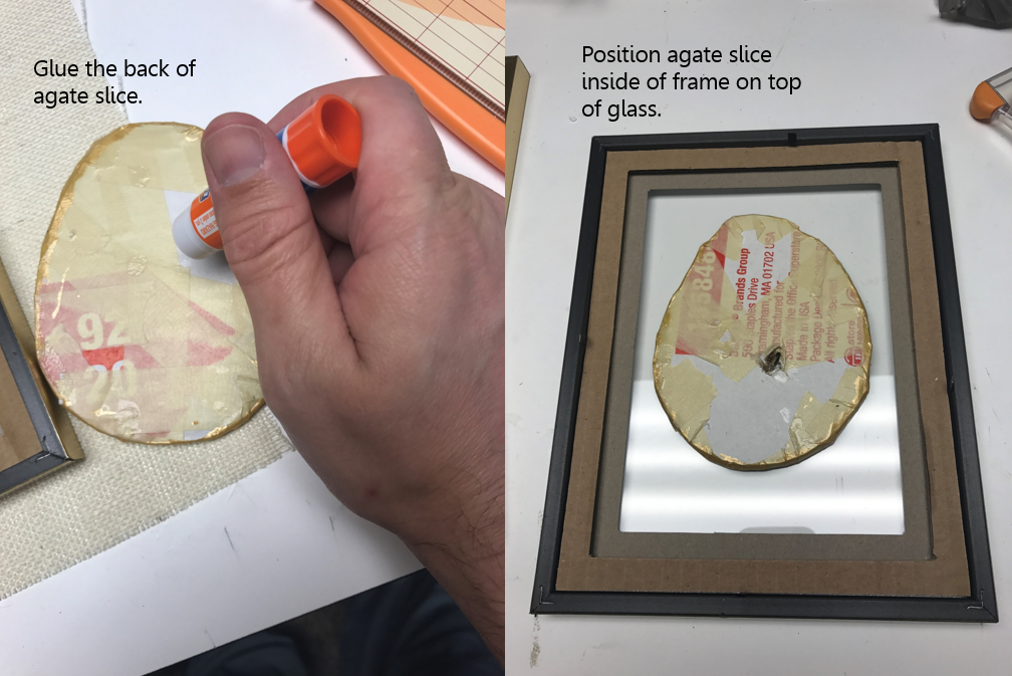 Position your agate slice where you want it on the glass, glue side up, and then position your decorative paper on the back of the slice. Gently press down to secure the paper to the back of your slice.