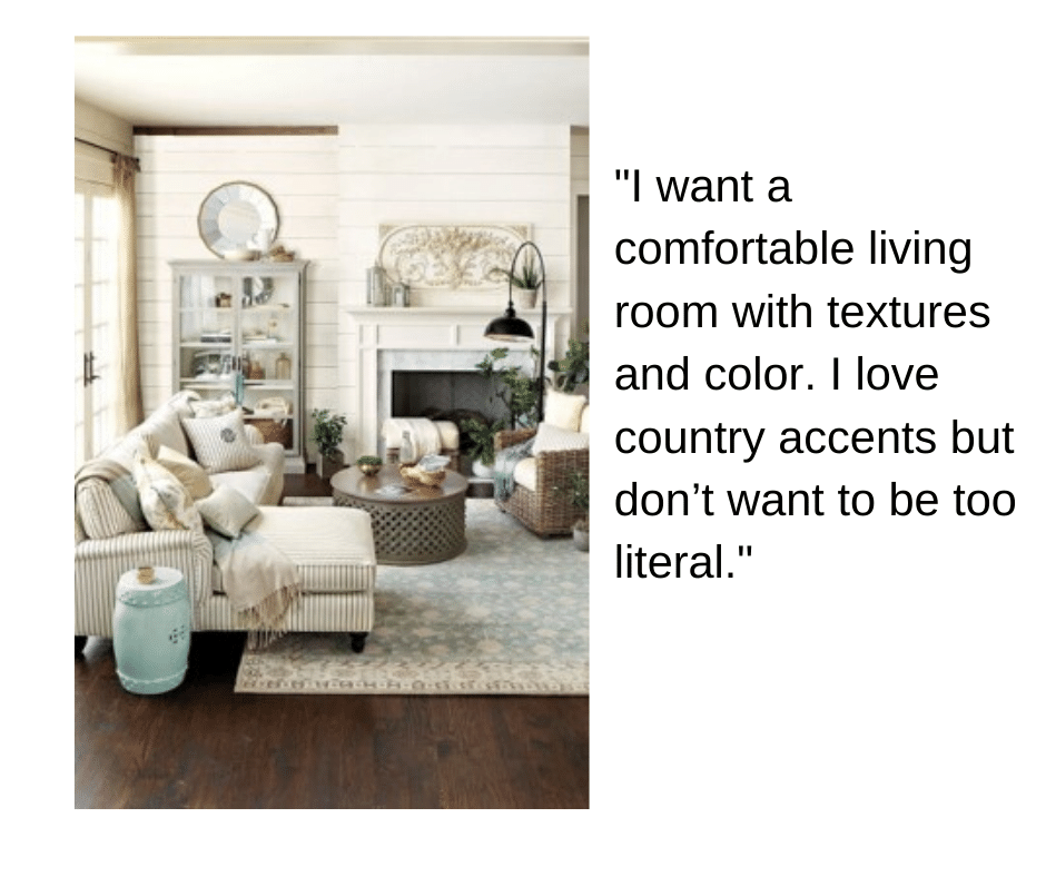 What natural elements do you want to see? Plants, wicker or rattan baskets, tapestries for the wall or pillows. Apply the 60%, 30%, 10% rule. Notice the entire composition of the inspiration picture, what is the main color you see? That is the 60%. The next most prevalent color is the 30% and the hints or accent colors make up the balance of 10%.