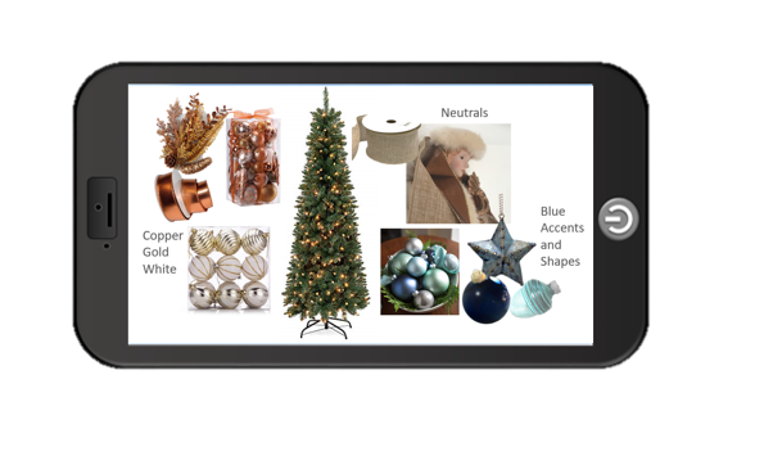 It also keeps you on track with the actual pieces you want to incorporate. For example, I knew, from planning the mood board, that I wanted copper ribbon, not blue ribbon and I wanted to hunt down some different shaped blue ornaments. I also wanted to find some gold and copper picks for the top of the tree.