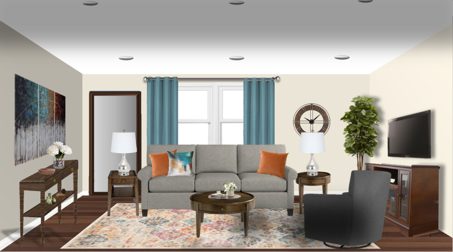 This is a great opportunity to add in additional wood tones, textures or finishes. It’s not completely necessary to match the colors of your area rug for this example. In fact, I would suggest using your large accessories to add in some contrast. If you have a neutral, tone on tone space, try introducing some dark elements to add in some contrast. Take the large learner mirror on the back wall, this is a different wood tone from the other pieces. It has a distinctive weathered wood frame and that is completely different in color and texture from the medium wood tones of the matching accent tables. The mirror is a total contrast to the tables in texture, color and style. The large wall clock is another example of using a piece that is playing “against type” here as well. It has a much more minimal style that compliments the mirror and allows for some needed contrast on the light painted wall. It’s a great size, 24” x 24”, so it fills that other side of the window up nicely and provides a bit of balance for the mirror. Lastly, it is round which reinforces the round end and cocktail tables. It also breaks up all the right angles and provides a softness to the overall composition.