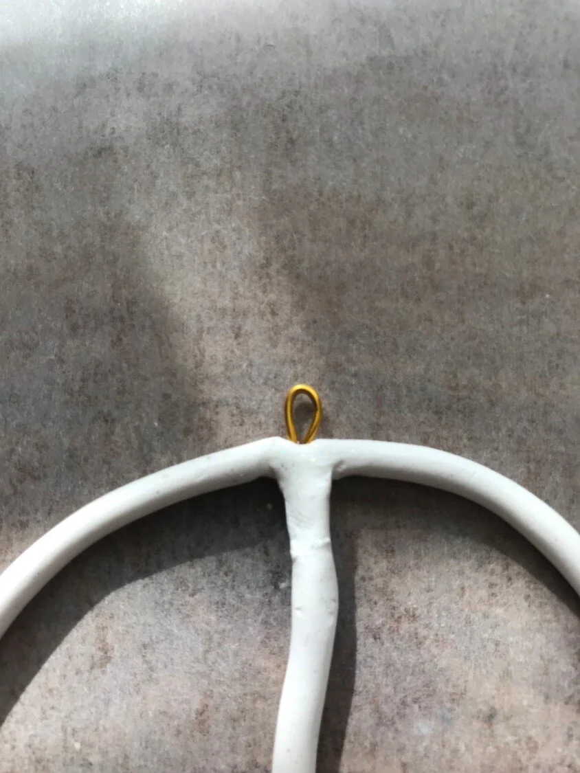Poke the long end of the wire through the top of the peace symbol making sure it doesn’t pierce through the clay.