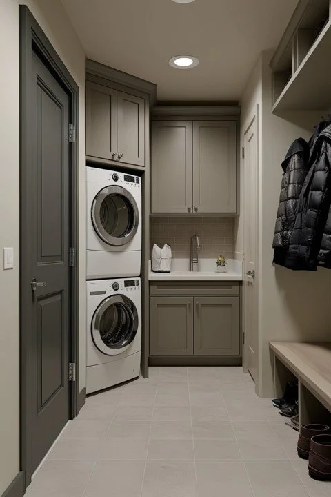 Each of these images shows a creative and practical way to merge laundry and mudroom functions within a small or narrow space. The key is to find the balance between storage, efficiency, and aesthetics—so that that everything serves a purpose and maintains a cohesive look.
