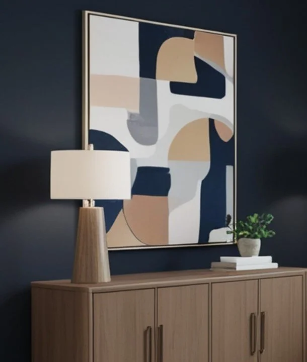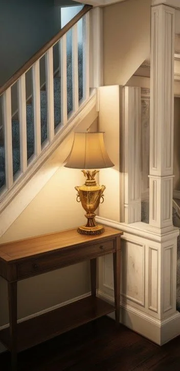 What this does: It gives people something to look AT instead of feeling like they hit a dead end. The art creates a focal point. The table adds purpose and functionality, a place to set things down. Either one says 'this is intentional' instead of 'this is awkward.'