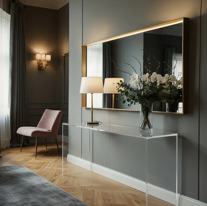 Glass or lucite console table: Light passes through instead of stopping at an opaque surface