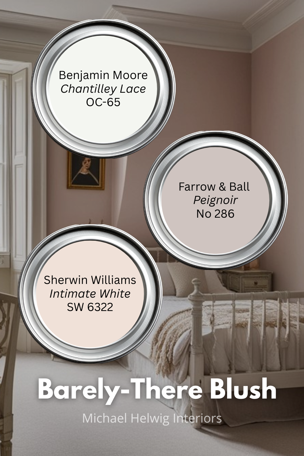 Colors to look at: Sherwin-Williams Intimate White (SW 6322), Benjamin Moore Chantilly Lace (OC-65) used as a base with a warm light source, or Farrow & Ball Peignoir No.286 for a more visible blush (works in larger small rooms).