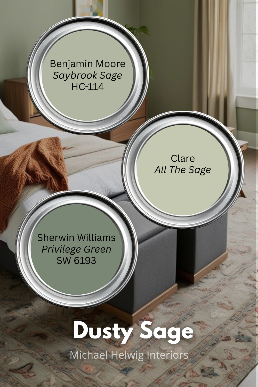 Colors to look at: Sherwin-Williams Privilege Green (SW 6193), Benjamin Moore Saybrook Sage (HC-114), Clare, All the Sage (a modern option with great online reviews for small spaces).